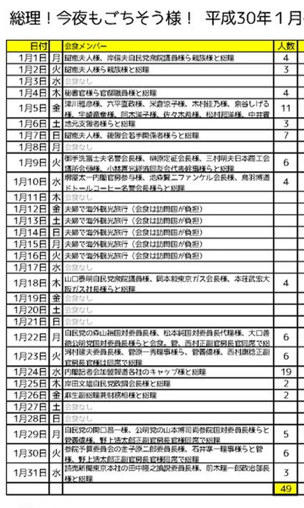 このように、同夕食会に関して、安倍晋三後援会としての収入、支出は一切ないことから、政治資金収支報告書への記載は必要ないものと認識しております。 |
