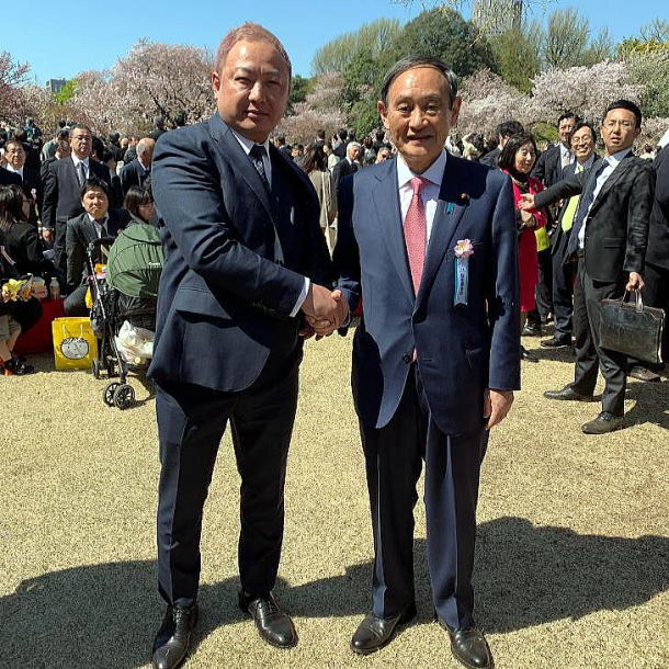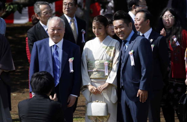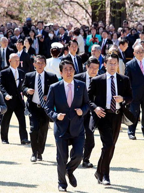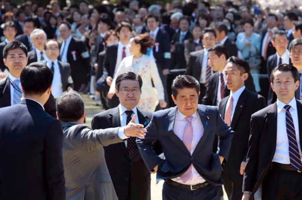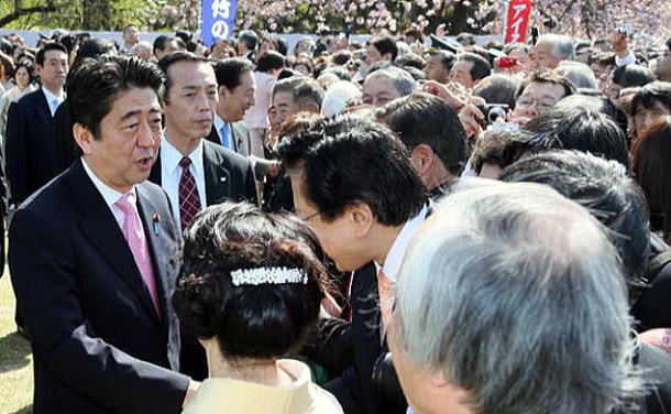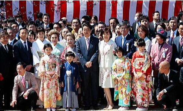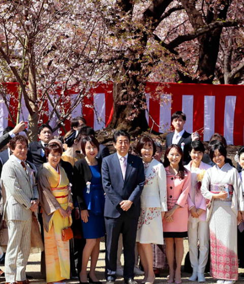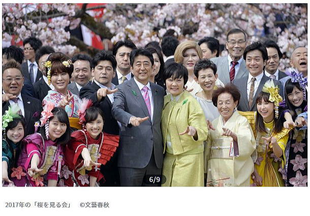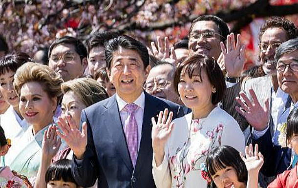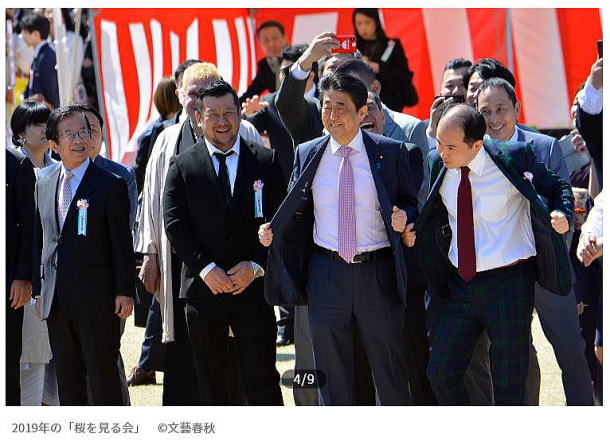 | 「桜を見る会」での安倍首相(当時)(写真:ロイター/アフロ) |