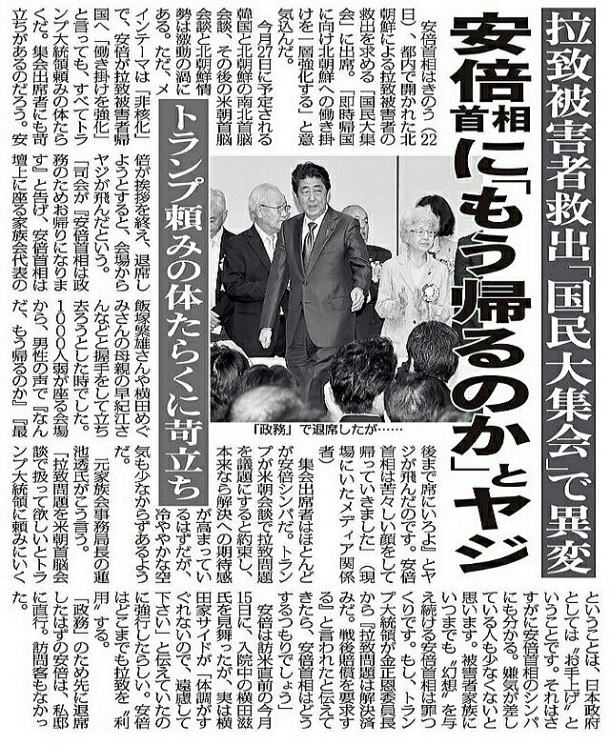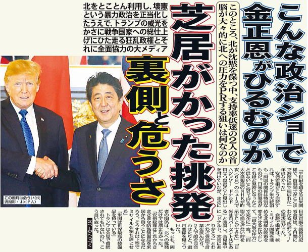 二言目には「いかなる事態でも国民を守り抜く」と口にしているが、トランプ大統領と一緒になって北朝鮮を挑発し、国民を危険にさらしているのだから、やっていることはアベコベである。