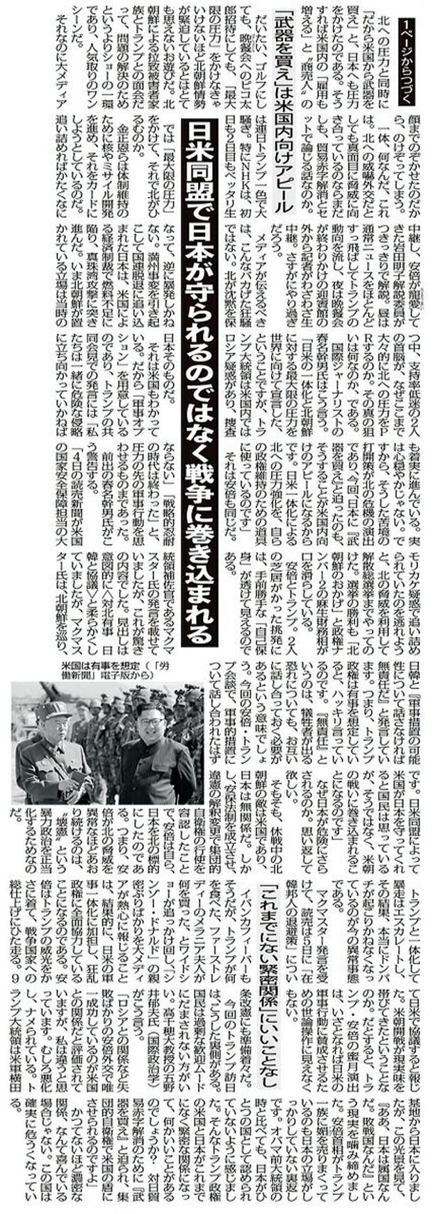 だから、絶対に米軍に武力行使をさせてはいけない。なのに安倍首相は、「すべての選択肢をテーブルの上に置いているトランプ大統領を高く評価しました」と高揚して語っているのだから信じられない。