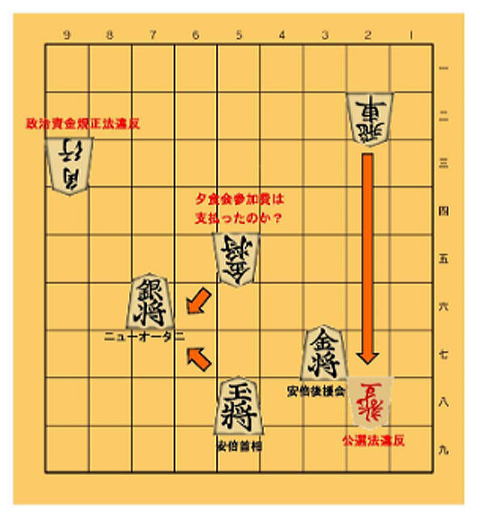 「5八」に位置する安倍首相の「玉(ぎょく:王将)」を守る駒として、「3七」の位置に安倍後援会の「金」(斜め後方以外の場所に1マス動かすことができる駒)、「7六」の位置にホテルニューオータニの「銀」(左右と後方以外の場所に1マス動かすことができる駒)という「二つの駒」があった。