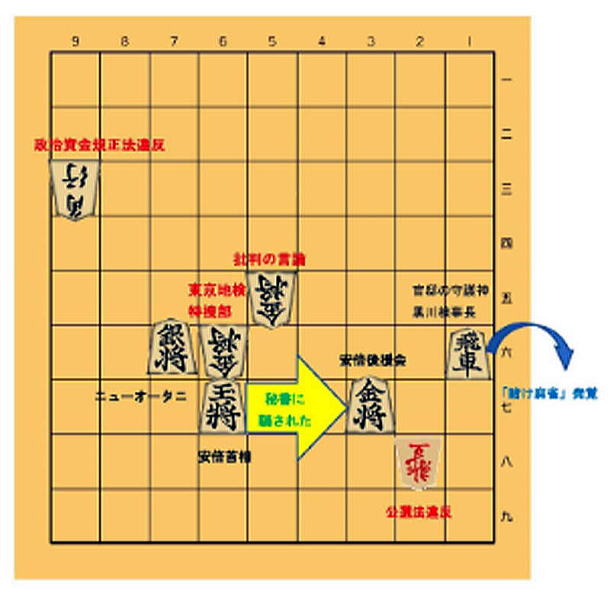 政治資金規正法違反の「9三角」が効いている(玉で「金」を取ろうとしても、前後左右の斜めにどこまででも動く「角」にとられてしまう)ので、「6六金」の王手で、完全に「詰み」なのである。