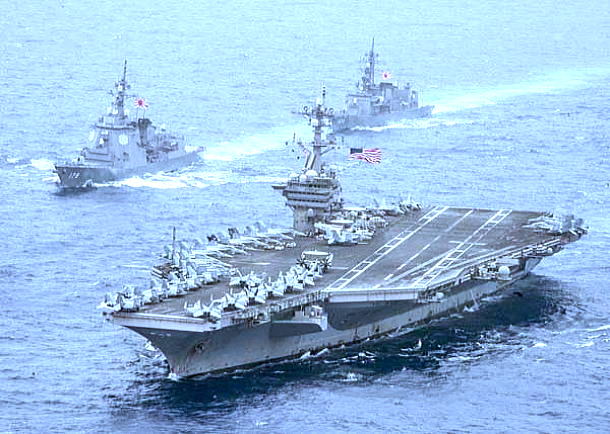 日本の海上自衛艦「あしがら」と「さみだれ」が、アメリカの空母「カール・ビンソン」と共同訓練を開始した。23日、フィリピン東方で合流し、現在、朝鮮半島へ向けて並んで北上している。カール・ビンソンが、北朝鮮に圧力をかけるために朝鮮半島に向かうと分かった直後、日本政府から合同訓練を持ちかけたという。