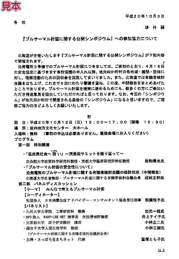 9日後に原発に近い岩内町で開かれるプルサーマル導入がテーマのシンポジウムについて説明した上で、「プルサーマル計画を確実に進めるためにも、数多くの方にご参加いただき推進意見を提出していただければと思っております」と、堂々とやらせを促している。