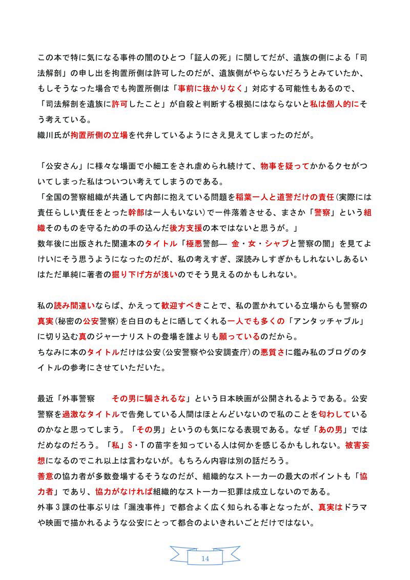 24日、通常国会が開会します。私の頭の中では、相変わらず「特定秘密保護法」が思い巡っています。特定秘密保護法は2014年内に施行(法律として効力を発すること)される予定ですが、6月末までの通常国会で、政府、国会がどのような議論を進めていくのか、いずれの動きにも目を離さないようにしています。一日、一日と、法の施行が近づいています。