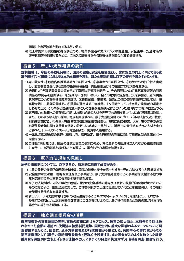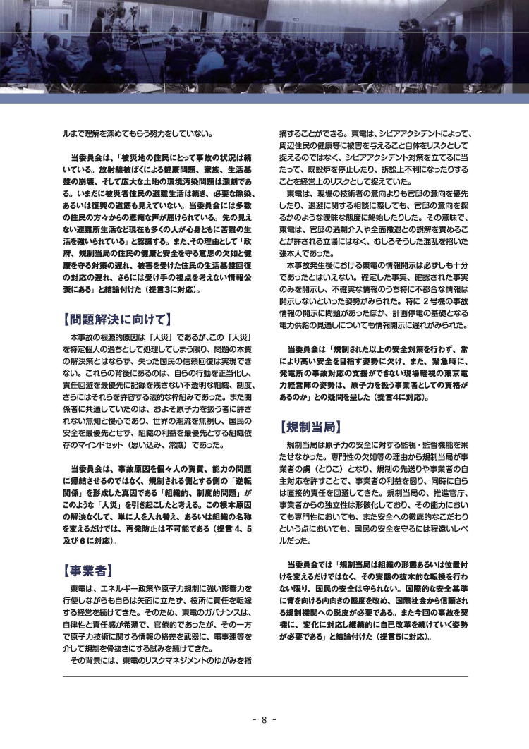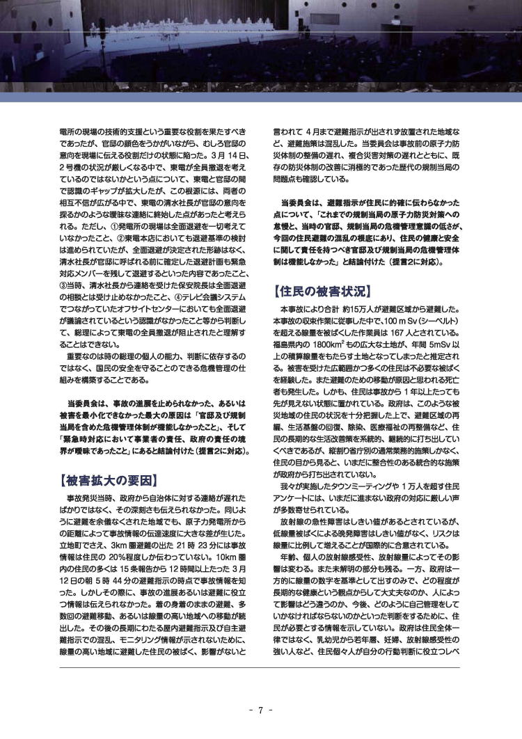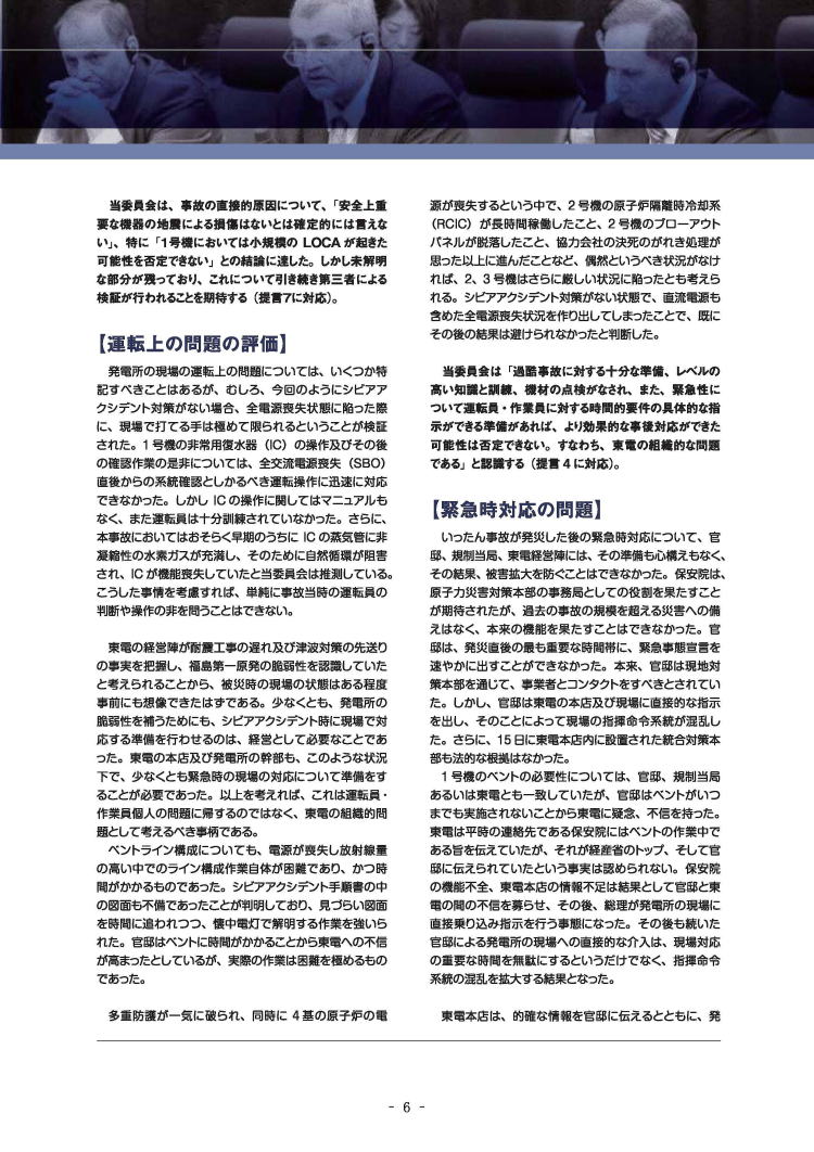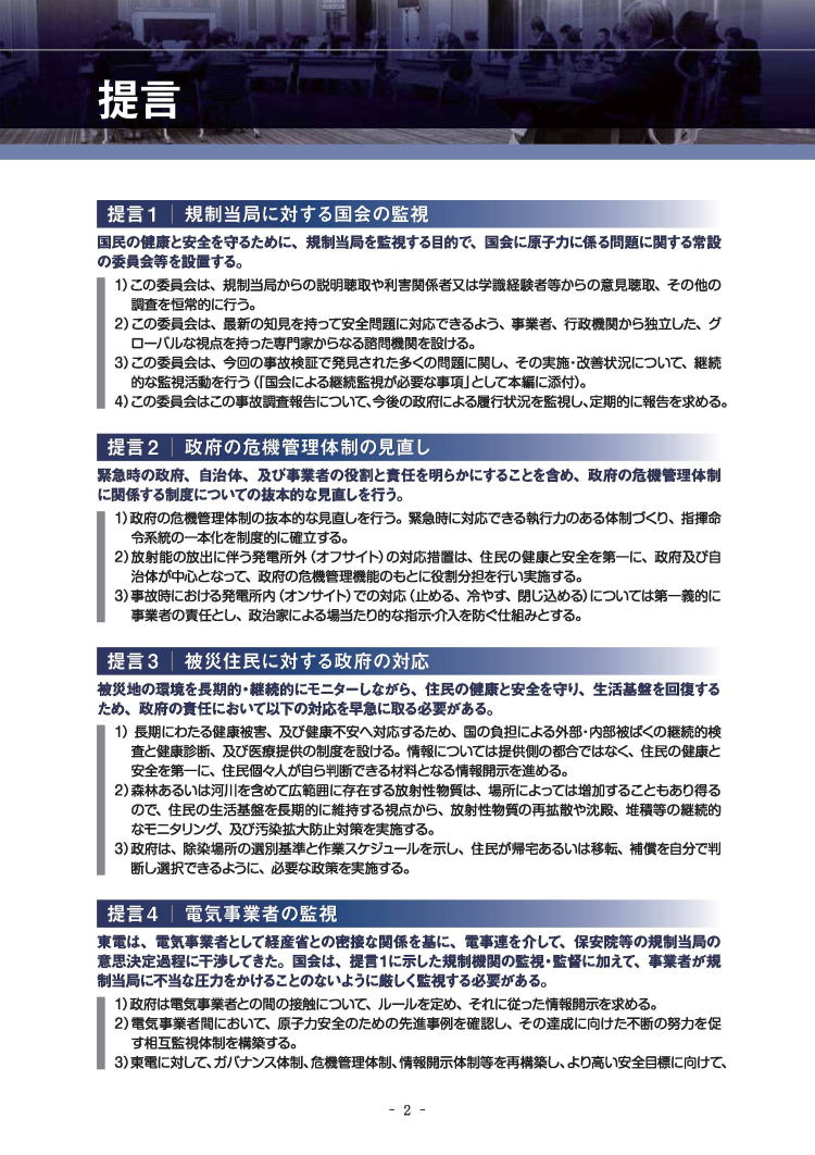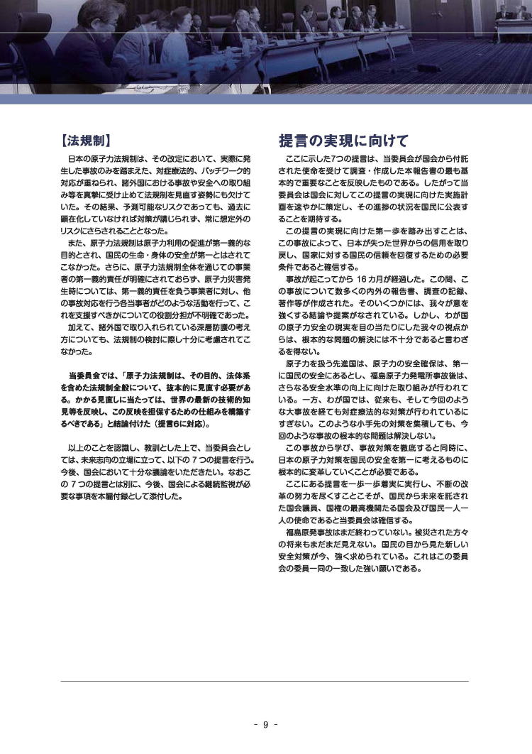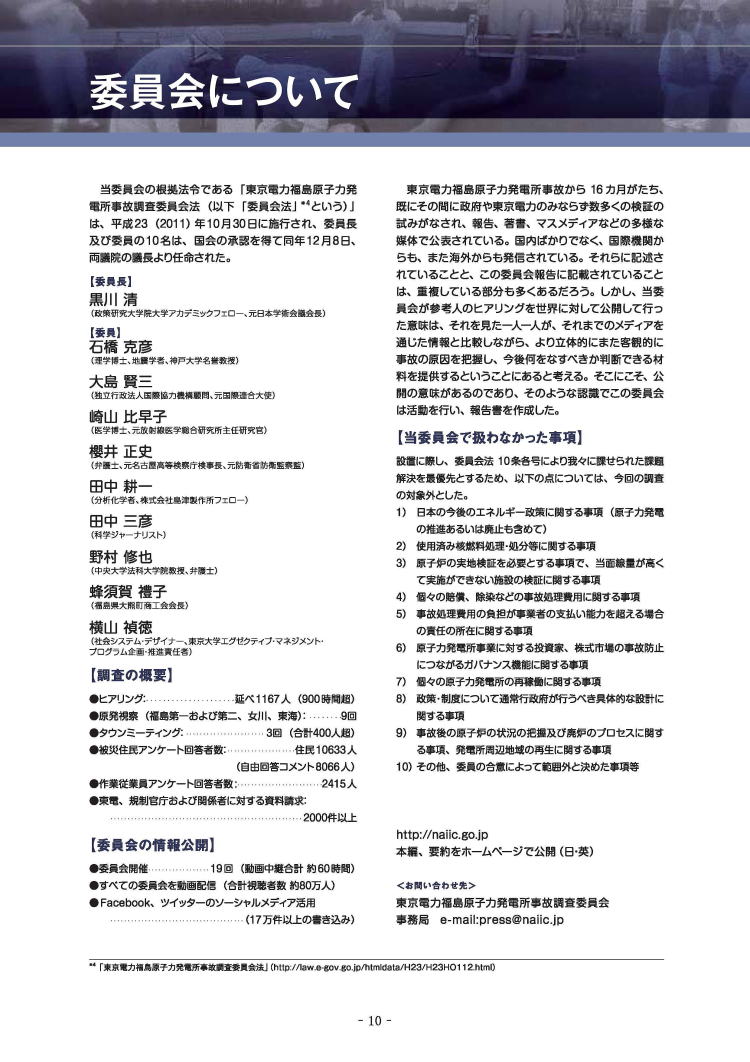 平成24年7月5日、国会事故調は、これまでの約半年間の調査活動の結果である報告書を、両院議長に提出した。本ページには、報告書本編のほか、住民・従業員へのアンケート調査結果を含む参考資料、第1回から第20回までの会議録、ダイジェスト版を掲載する。このほか、英語版ページでは、Executive Summary を公開している。「国会事故調ホームページより引用」