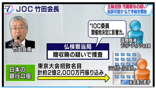 2020年東京五輪・パラリンピック招致をめぐる裏金問題で、フランス捜査当局が日本オリンピック委員会(JOC)の竹田恒和会長を贈賄の容疑者とする予審手続きを開始。刑事訴追に向けた動きの本格化だ。11日、日本でも一斉に報じられ、大騒ぎになっている。