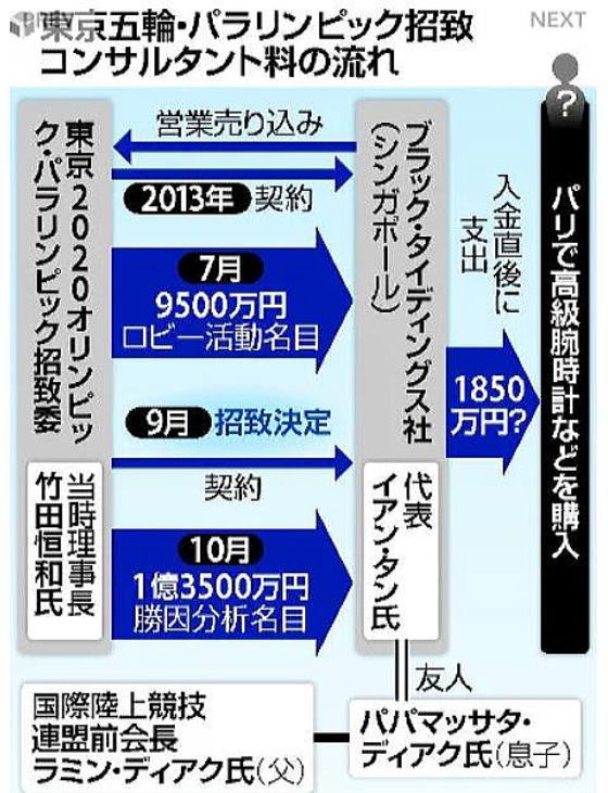 同13日 招致委理事長だった日本オリンピック委員会(JOC)の竹田恒和会長が、イアン・タン氏が代表を務めるシンガポールのコンサルタント会社「ブラックタイディングス社」と契約して、2億3000万円を送金したことを認める。
