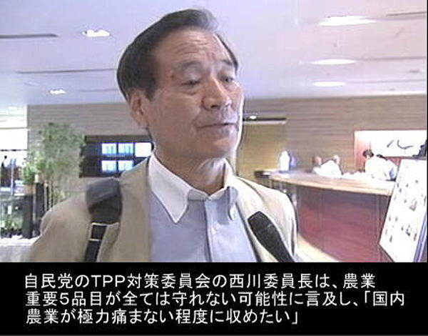 そもそも、TPP対策委員長の西川公也自身が、「農産5品目の関税は守れない」と、2013年7月24日のマレーシアTPP交渉会合で言っていたのだ。最初から、農産5品目のすべてを売り渡すつもりだった、ということ。