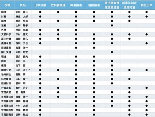彼らにとってもちろん、夫は全ての領域で配偶者を支配しなければならない。彼らはまた、戦前の風習に戻ることを望んでいよう。学校では、まず男子、次いで女子の五十音順で点呼されること… とりわけ、戦後の裁判で裁かれた戦争犯罪人を含む、死亡した兵士が祀られる、靖国神社に国家が関わることを邪魔する、宗教と国家の分離に関する16条も廃止することを目指す(中国と韓国の気分を害して、安倍晋三は2013年12月、首相就任1周年に靖国神社を参拝した)。
