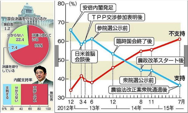 農産物の重要品目の聖域確保を求めた国会決議が守られたかどうか聞いたところ、『決議違反』としたのは69%に達した。安倍晋三首相は、農業分野を含めて『国益にかなう最善の結果を得ることができた』との認識を示しているが、生産現場の受け止めと大きく懸け離れていることが浮き彫りになった。安倍内閣を支持するとしたのは18%とかつてない低水準にまで下がり、不支持は59%に上った」という。