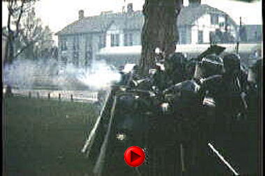・過激派の投石攻撃に対し応戦する教職員と学生。