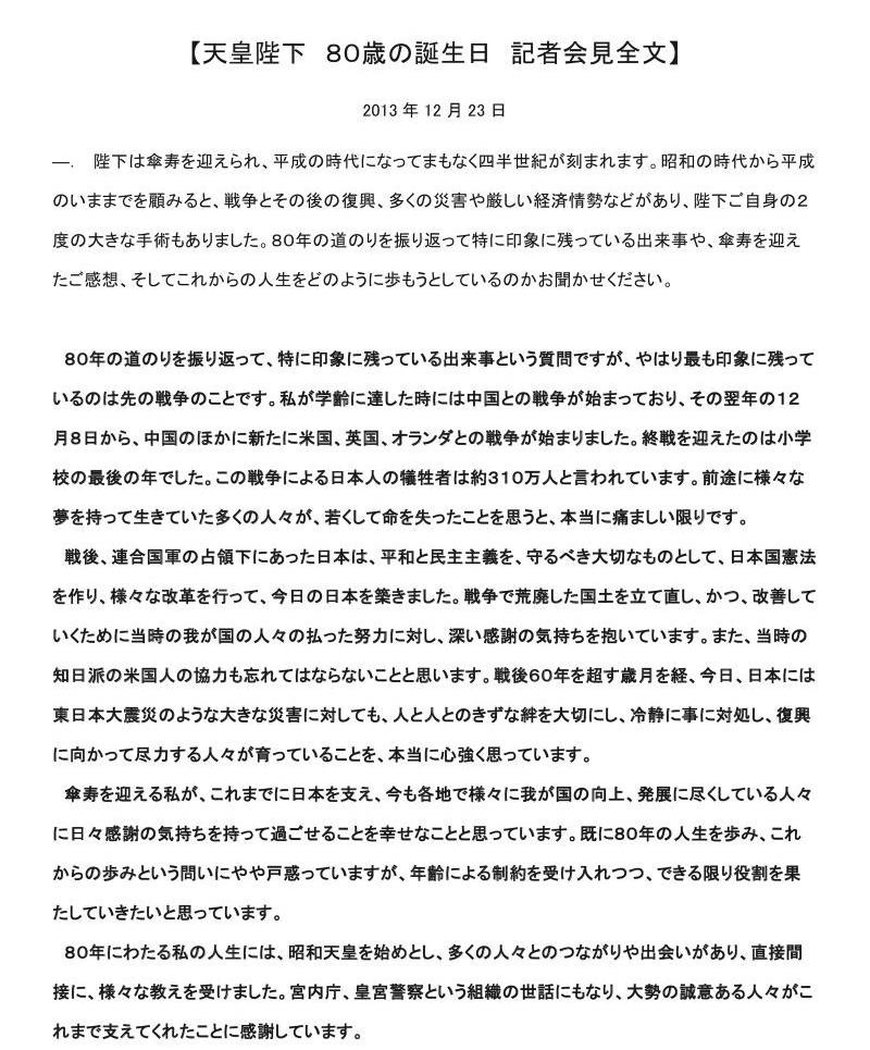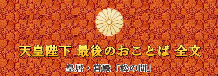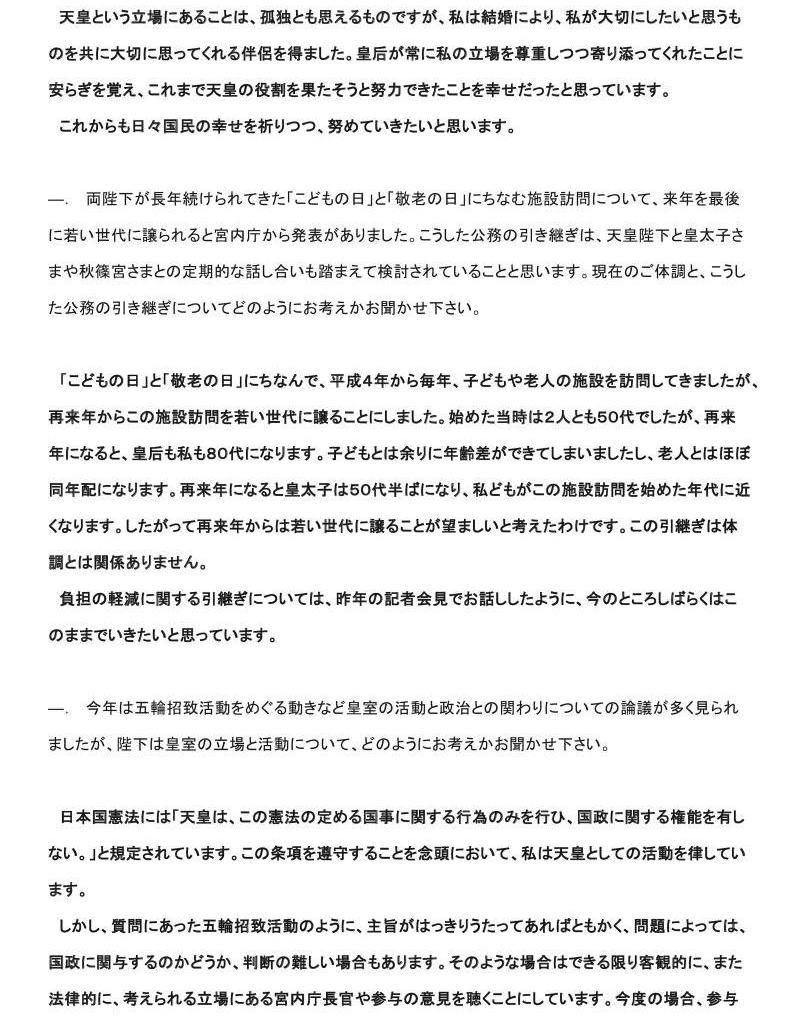 We are now coming to the end of the year, and the day of my abdication in the spring of next year is approaching. Ever since ascending to the throne, I have spent my days searching for what should be the role of the Emperor who is designated to be the symbol of the State by the Constitution of Japan. I intend to carry out my duties in that capacity and shall continue to contemplate this question as I perform my day-to-day duties until the day of my abdication.