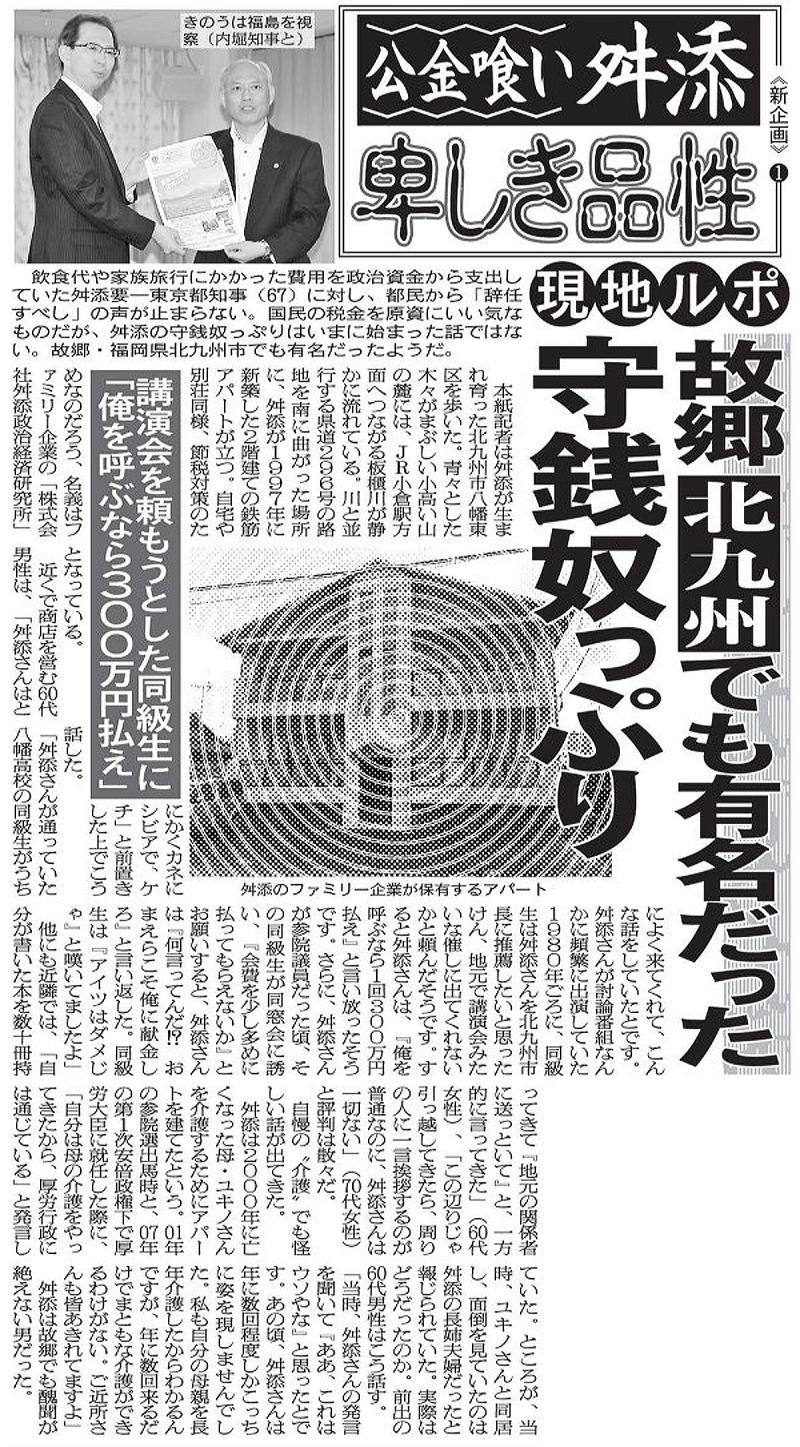 本紙記者は舛添知事が生まれ育った北九州市八幡東区を歩いた。青々とした木々がまぶしい小高い山の麓には、JR小倉駅方面へつながる板櫃川が静かに流れている。川と並行する県道296号の路地を南に曲がった場所に、舛添知事が1997年に新築した2階建ての鉄筋アパートが立つ。自宅や別荘同様、節税対策のためなのだろう、名義はファミリー企業の「株式会社舛添政治経済研究所」となっている。
