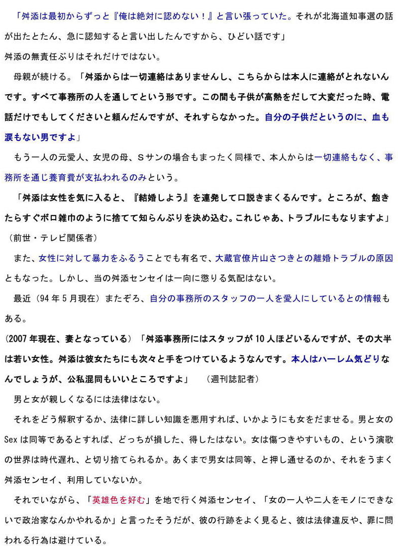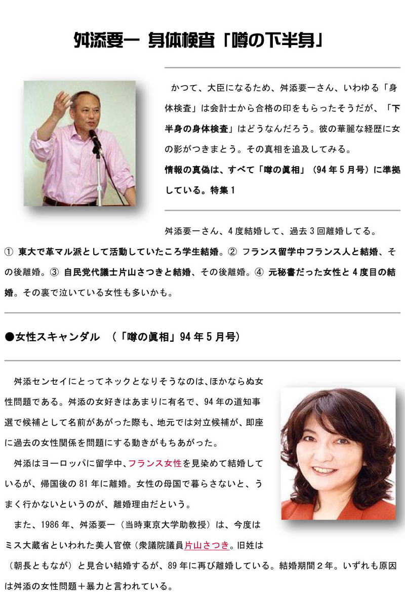 「そんな性格だから、あの人には『親友』と呼べる人は一人もいません。かつては一人だけいたのですが、01年に参院議員になってから仲たがいしてしまった。今、あの人の周りにいるのは、チヤホヤと持ち上げてくれるような人だけです。昔は貧しい生活を送り、苦労していたのは確かです。『偉くなりたい』と思っていたのか、学生時代は家に帰ってきても、ずっと勉強していたといいます。勉強が一番好きで、頭がいいのは分かりますが、あの人には人としての『常識』や『情』が決定的に欠けてしまっている。だから、偉くなるためには『母親の介護を長年やってきた』と、ありもしないウソを平気でつけるんでしょう。私はあの人の会見など見る気もしませんが、自分の身を守るため、都合のいい話をつくっているとしか思えません」