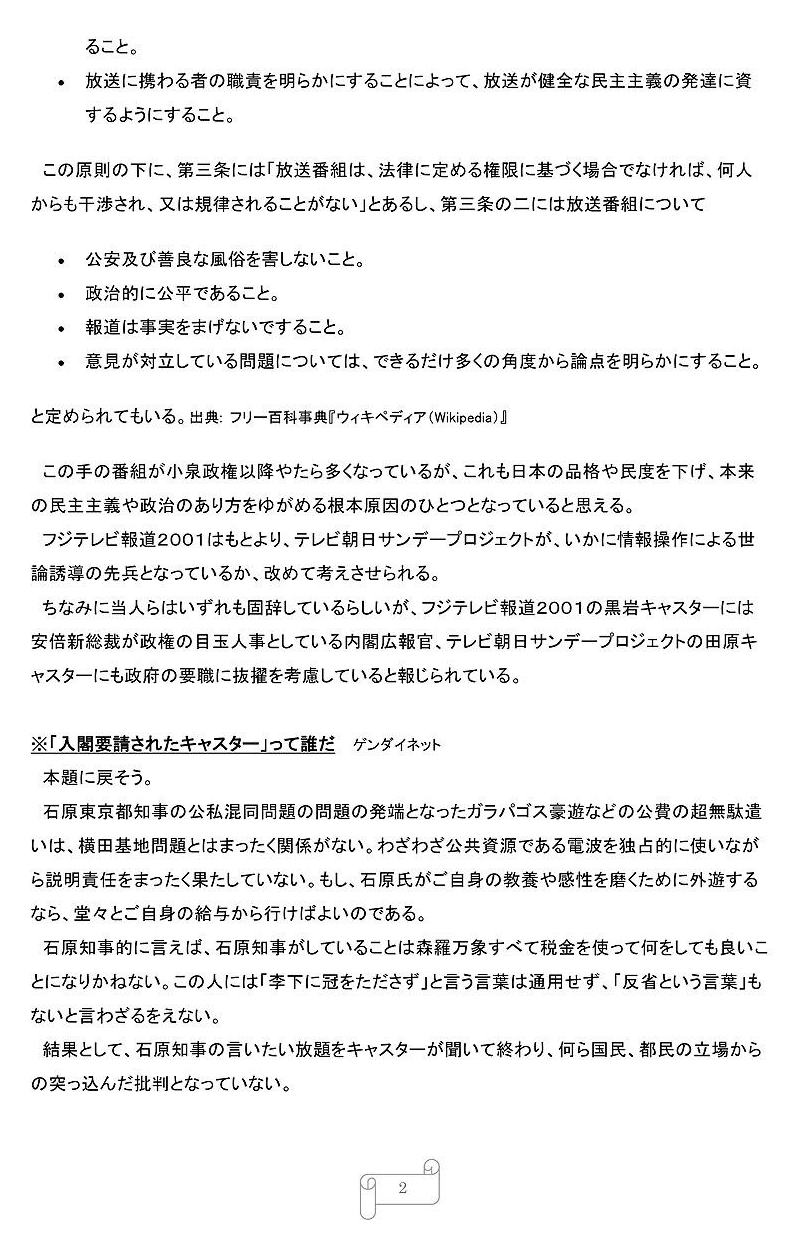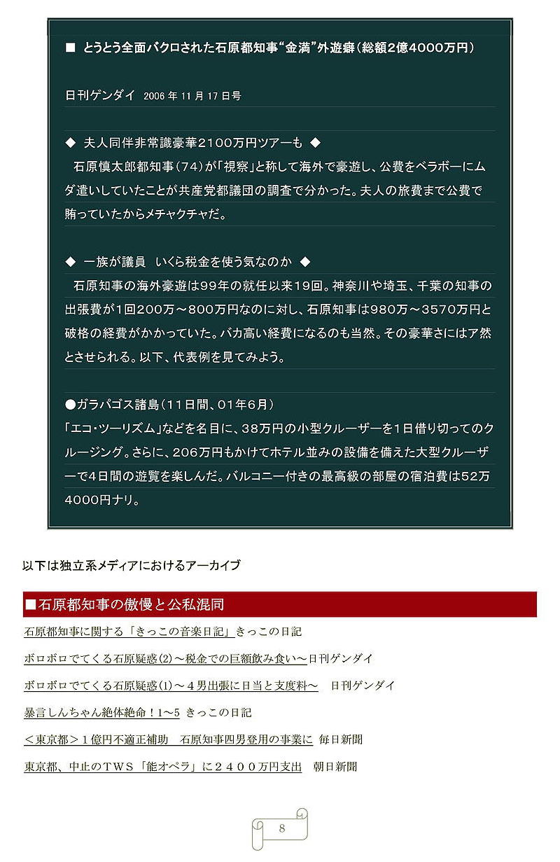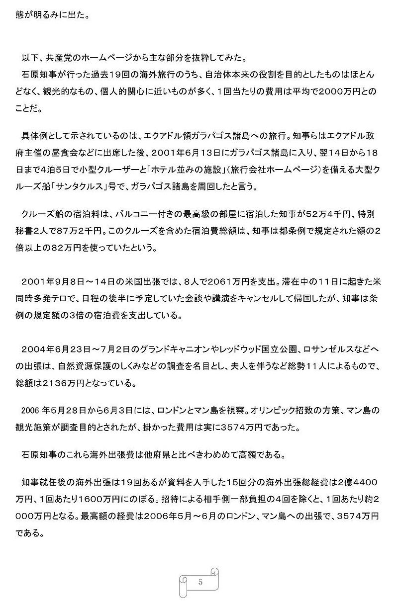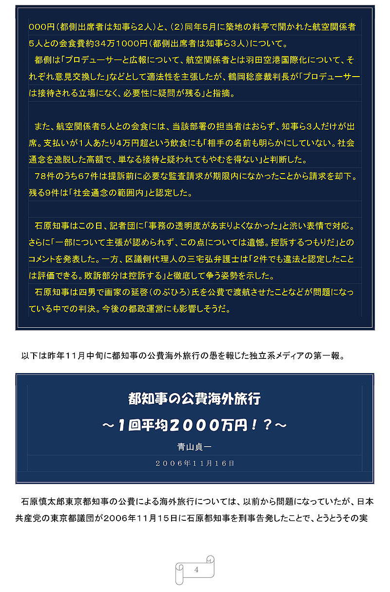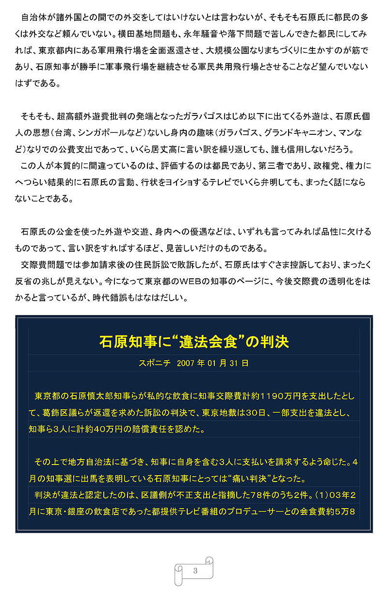 〈公用車の利用にかかる経費は都民の税金であり、公私混同の観点からも、都内に知事がいない危機管理の観点からも、これは大きな問題〉と断じている。