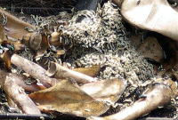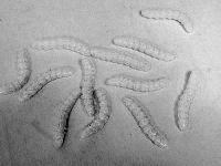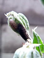 よく見ると、青虫は死んでいて、その体内からウジ虫が数匹、ニョロニョロと出ているではありませんか。 |