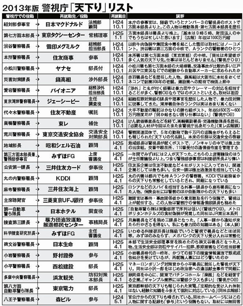 スクープ入手! 2013年版警視庁「天下り」リスト みずほFG 東京電力 マクドナルド 野村證券 西松建設 ほか 有名企業、問題企業がズラリ 現代ビジネス 経済の死角