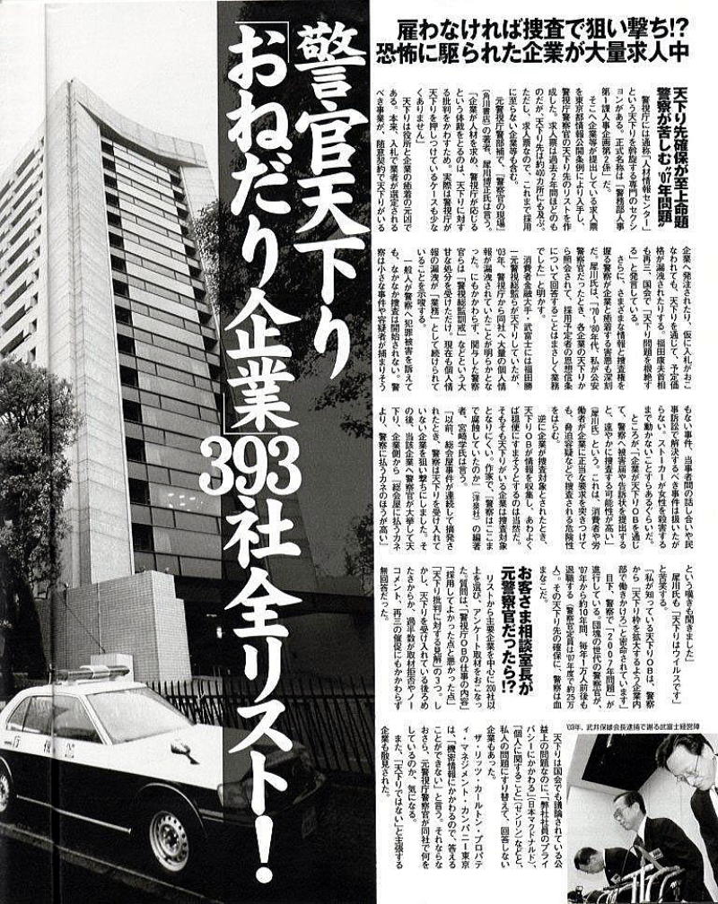 確かに、国家公務員の天下りに関してはずいぶん厳しくなりました。しかし、警視庁は霞が関にありながら、実は東京都の組織。そのため、盲点となってマスコミの批判を受けることもなく、今も天下りし放題なのです」(全国紙社会部記者)