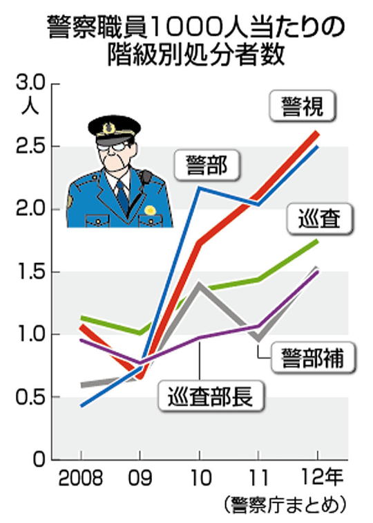 職員1000人当たりの懲戒処分者数を階級別に見ると、昨年は警視の2.6人が最も多く、次いで警部の2.5人、巡査1.7人、警部補1.5人、巡査部長1.5人と続いた。いずれも過去5年間で最多で、警視は2.5倍、警部は5.9倍に増えた。