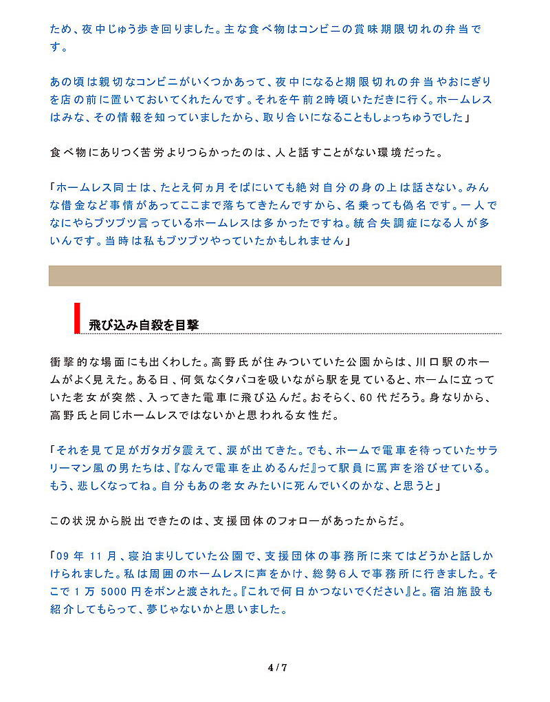 現在、加藤さんは厚生年金に足りない部分の約4万円は生活保護を受け、家賃5万円で滞納していたアパートから低家賃の住宅に転居し、健康状態も回復することができた。