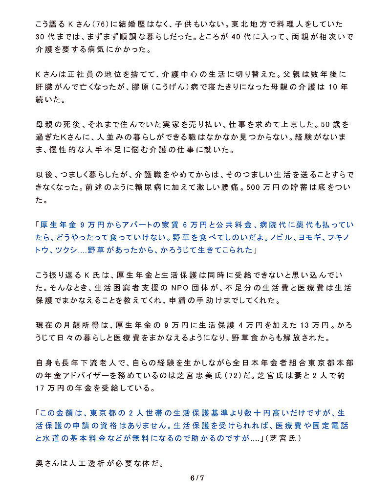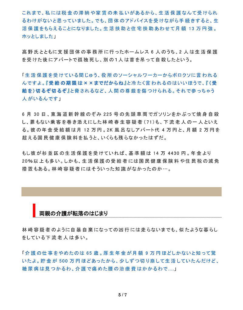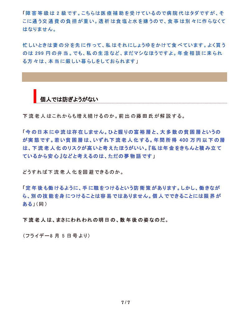 これらは、単に「かわいそう」といった同情や「自己責任」「自助努力」で解決できる問題ではない。簡単に“下流老人”に転落しかねない家族扶助を前提とした年金制度、負担ばかりが高まる医療費に家賃、「経済優先・弱者切り捨て」の原則に基づいた社会構造を見直すべきなのだ。