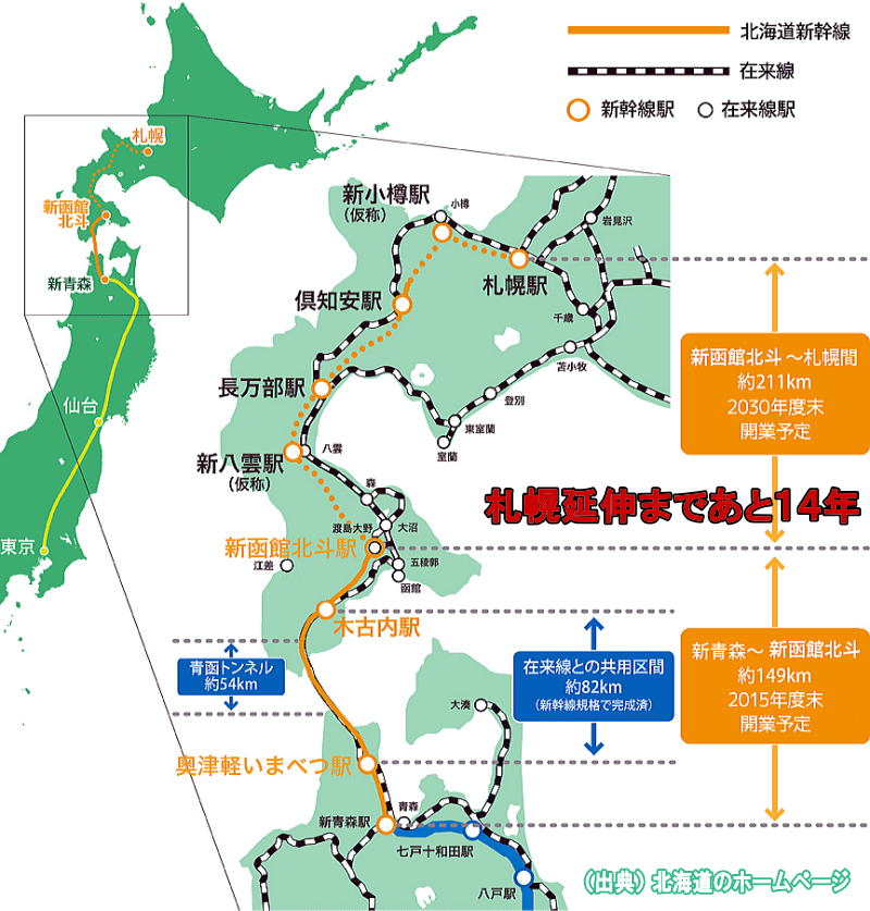 北海道庁のホームページでは、『2015年度末に予定される北海道新幹線の開業に向け、いよいよあと1年となりました!北海道では、3月20日(金)~29日(日)を「北海道新幹線開業1年前ウィーク』として、関係団体と連携して、さまざまなイベントを開催します。」 などと、子供染みた宣伝を大々的に行っているが、採算がとれるのかどうかや、在来線の問題等については述べられていない。